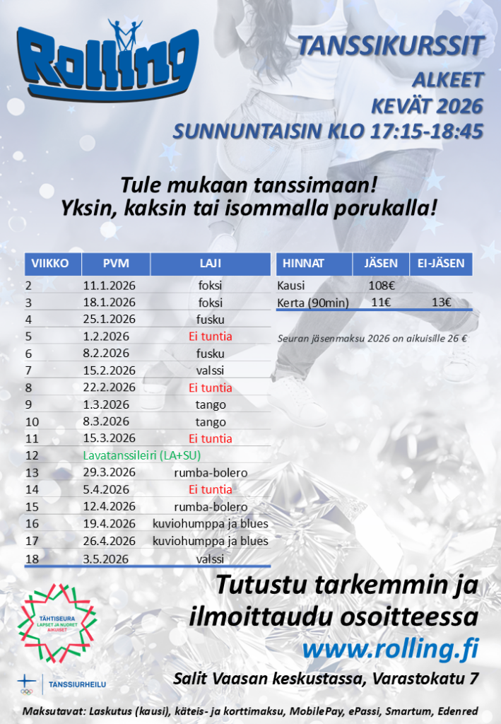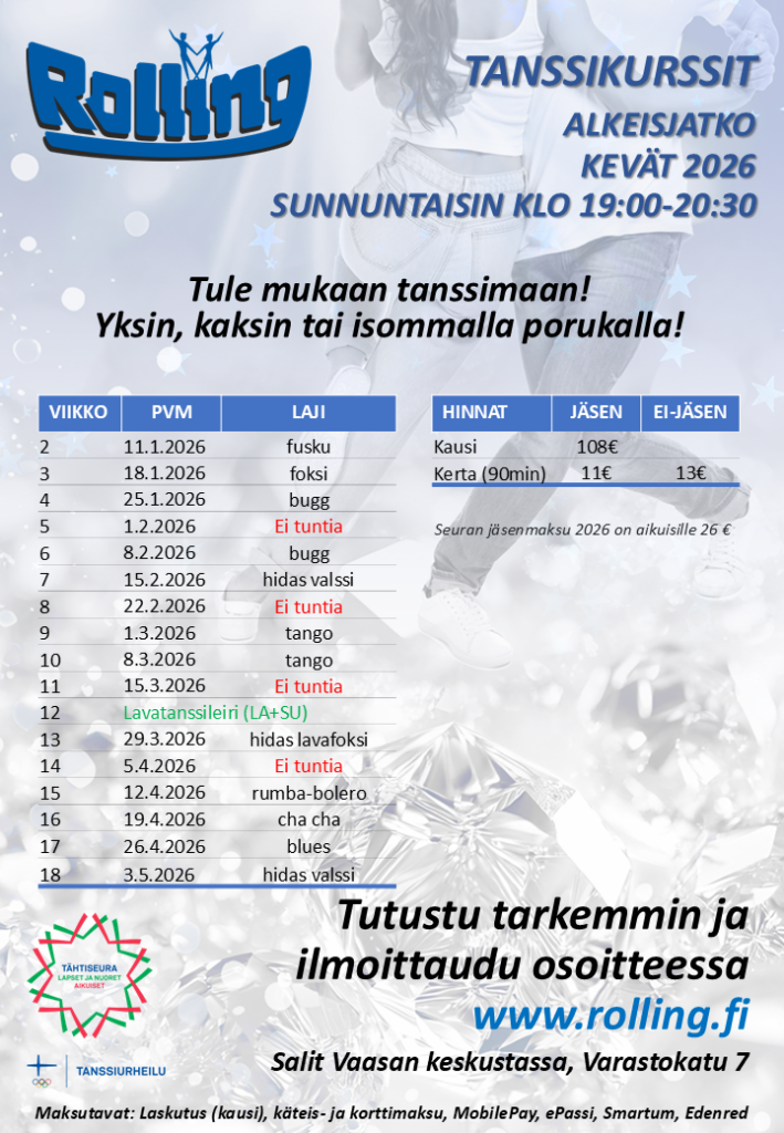 Järjestämme räätälöityjä häätanssikursseja pareille ja pienryhmille. Lisätietoja: hannu.haavisto@rolling.fi
